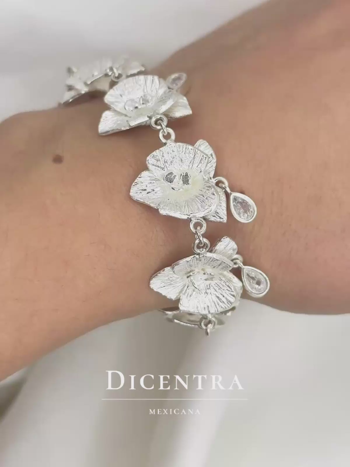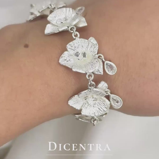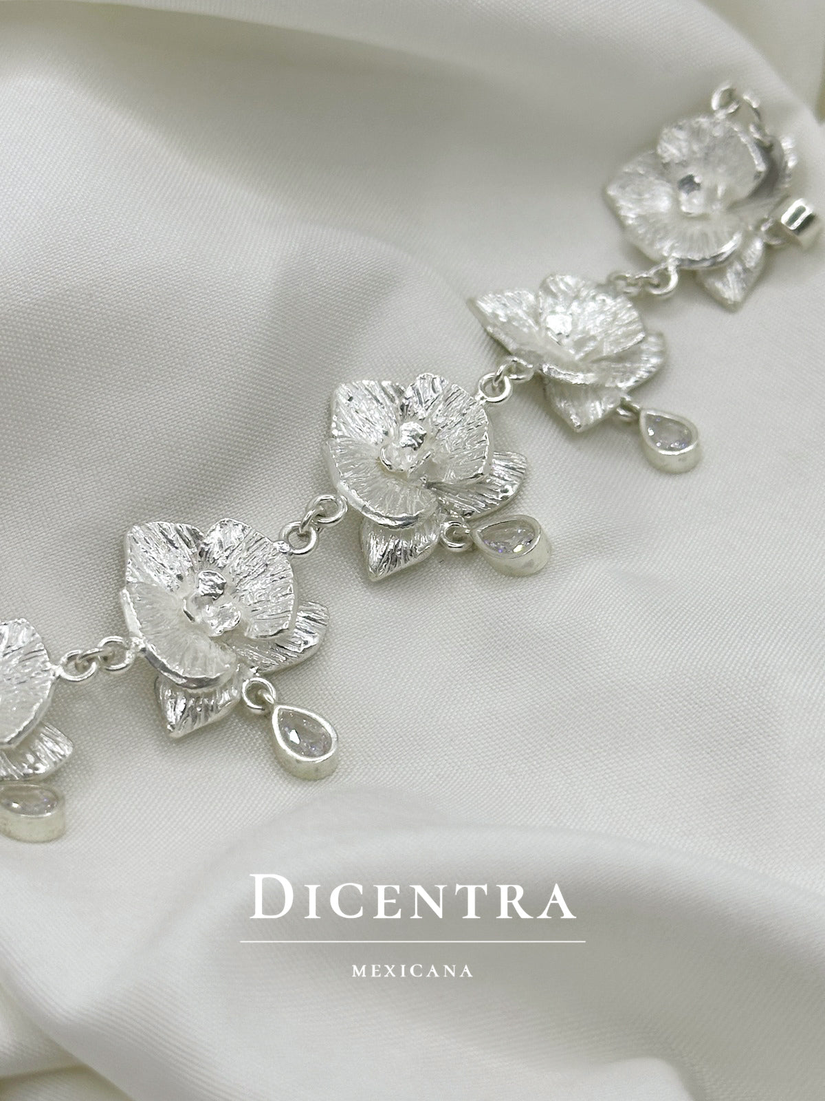 Este collar es una de nuestras piezas más elaboradas. Está conformado por ocho orquídeas modeladas a mano, cada una creada con atención minuciosa al detalle. Incorpora también ocho circonias en corte gota montadas a bisel, que aportan un brillo delicado y sofisticado.